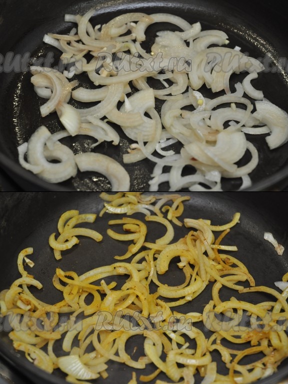 Обжариваем лук, присыпаем его карри или куркумой, чтобы он стал приятного золотистого оттенка. Добавляем к луку сок от печени и тушим в течение 5 минут.