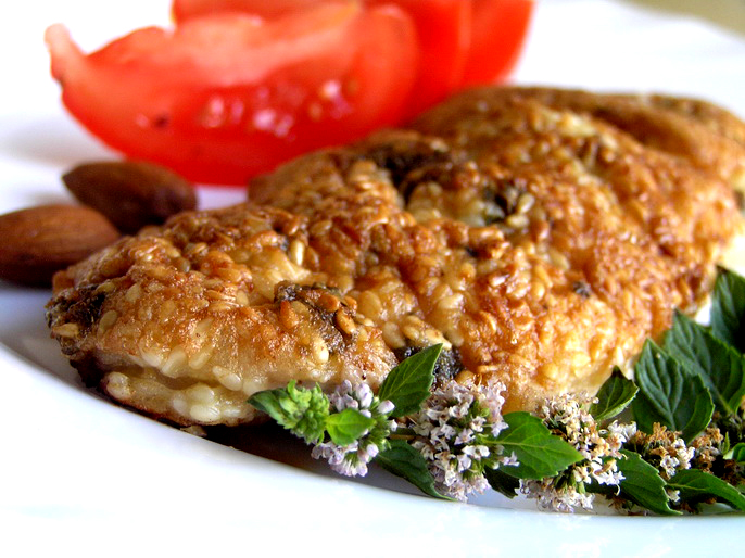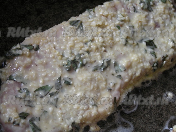 окунуть в яично-мятную панировку, затем обвалять в кунжуте. Обжарить свиную отбивную на растительном масле с двух сторон до румяного цвета.