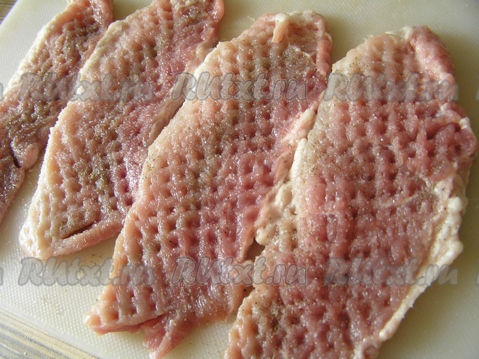 Мясо отбить, посолить, поперчить.