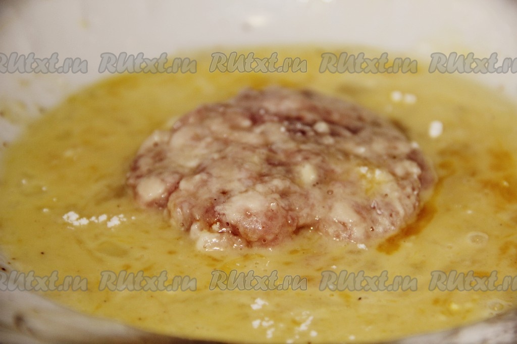 Приготовить кляр, для этого в глубокую тарелку вбить сырые яйца и взболтать их вилкой до однородности вместе с выдавленным через пресс чесноком, солью и чёрным молотым перцем. Каждый порционный кусочек фарша руками распластать в лепёшку. Обсыпать лепёшку мукой с двух сторон, а затем обмакнуть в яичный кляр с двух сторон.