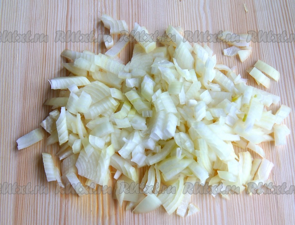 Лук очистить, мелко порубить и обжарить на растительном масле на среднем огне до золотистого цвета, помешивая время от времени.