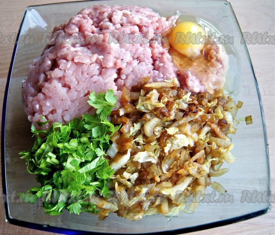 В глубокой миске соединяем куриный фарш, обжаренную капусту с луком, яйцо, мелко нарезанную петрушку, солим, перчим, перемешиваем.
