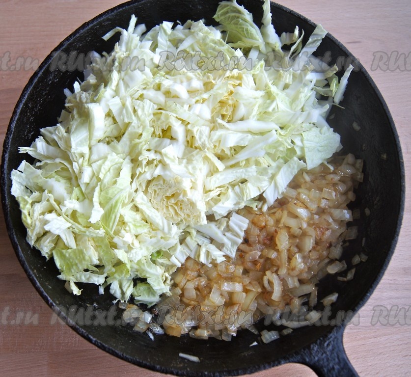 Нарезанную пекинскую капусту отправляем к обжаренному луку и обжариваем на небольшом огне минут 10, периодически перемешивая, затем снимаем с огня и даём остыть.