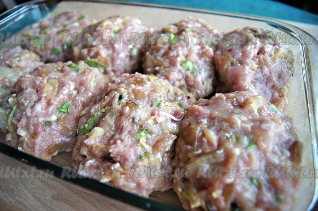Из фарша формируем куриные котлеты, выкладываем в огнеупорную посуду, смазанную растительным маслом, накрываем фольгой, отправляем в разогретую духовку и запекаем 40 минут при температуре 180-200 градусов.