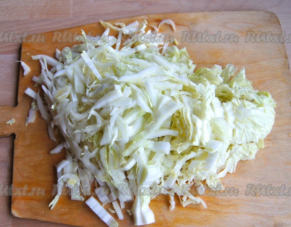 Пекинскую капусту вымыть, нашинковать достаточно тонко.