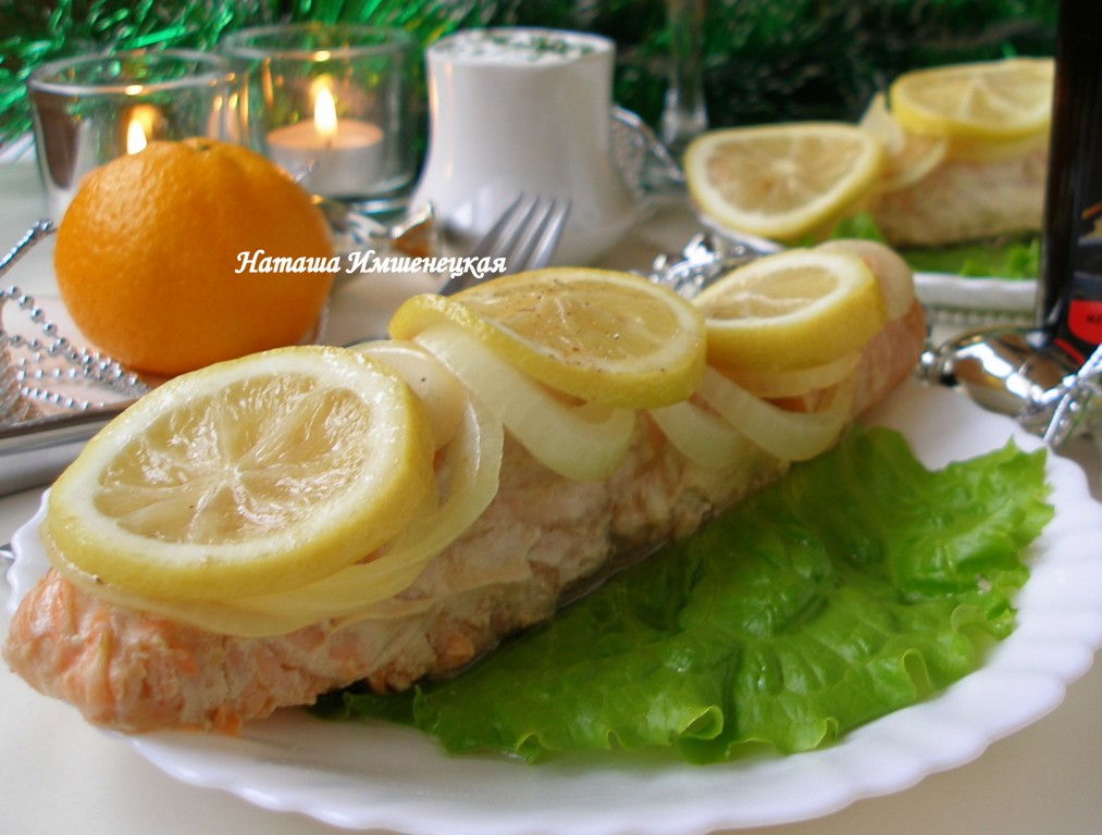 Сёмгу с лимоном и луком, завёрнутую в фольгу, запекать в духовке, разогретой до 200 градусов, минут 30. Готовую рыбу достать из духовки, дать немного остыть, снять фольгу и подавать к столу. Эта рыбка, замаринованная в соевом соусе, получается очень сочной, ароматной, нежной и необыкновенно вкусной!