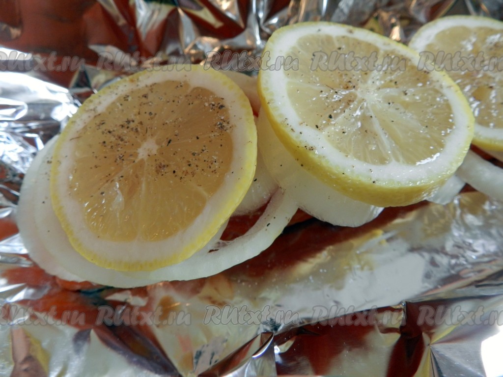 Отрезать 2 листа фольги. На каждый лист фольги выложить кусочек сёмги, замаринованный в соевом соусе. Поверх рыбы разложить кольца лука и лимона, можно немного (по вкусу) посолить и поперчить. Завернуть каждый кусок сёмги с лимоном и луком плотно в фольгу.