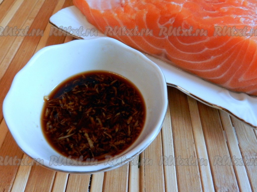 Смазать кусочки сёмги со всех сторон соевым соусом, смешанным с имбирём, оставить на 20-25 минут.