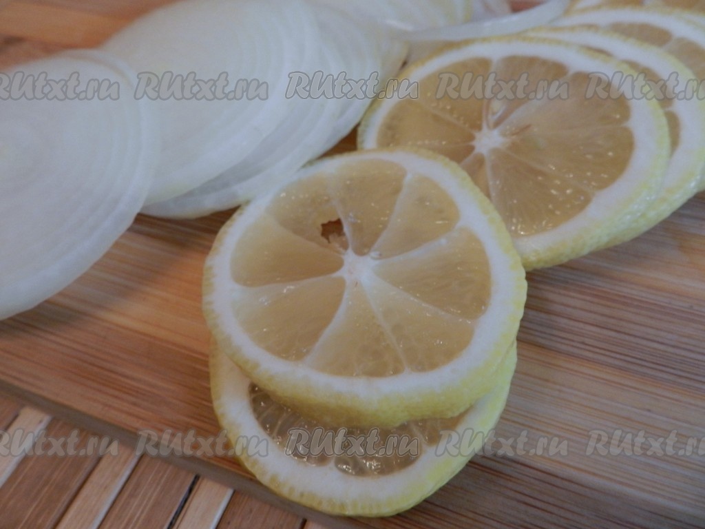 Лимон тщательно вымыть. Лук очистить. Лимон и лук нарезать кольцами.
