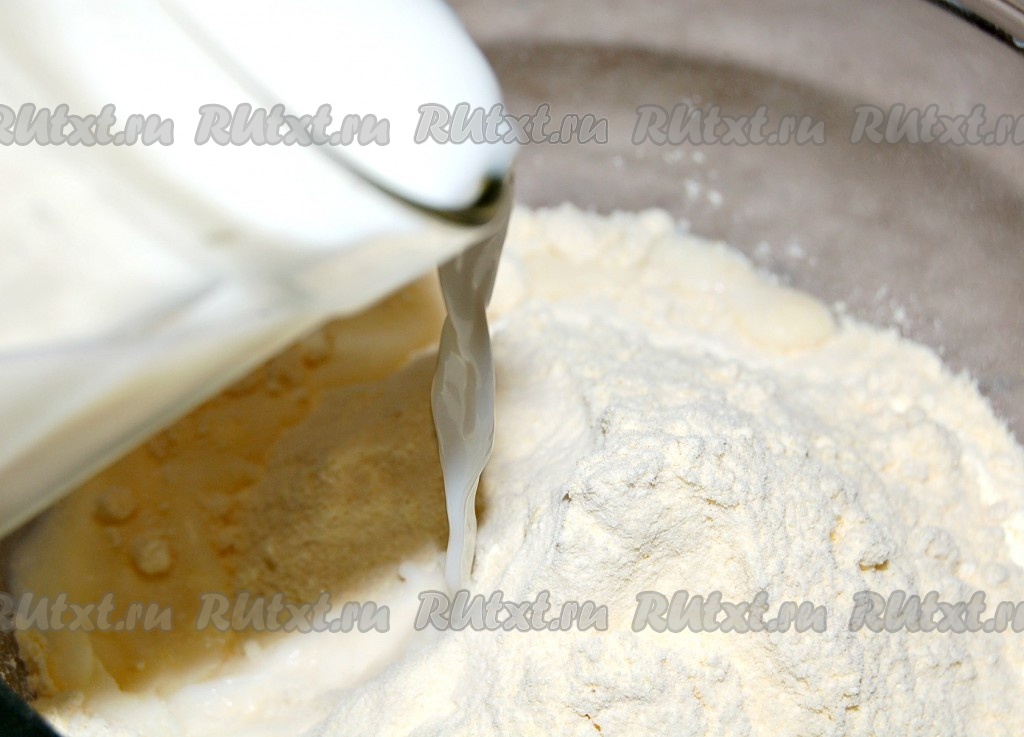 Подогреть воду с молоком до температуры, как могут терпеть руки (чтобы тесто замешивать). В смеси воды и молока развести соль и вылить полученную жидкость в муку.