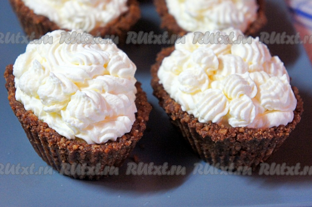 Сливки переложить в кондитерский мешок и украсить взбитыми сливками корзиночки произвольным образом.