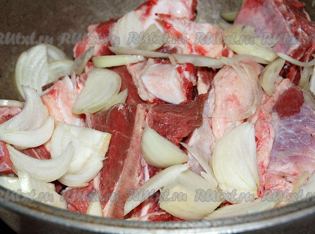 Уложить грудинку в казан, сверху уложить слой тонко нарезанного репчатого лука.