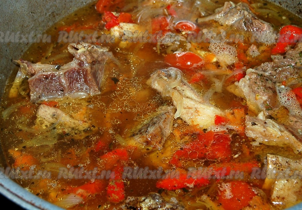 Аккуратно налить в казан горячую воду, чтобы она едва покрыла содержимое казана. Поставить вариться. Довести до кипения, затем уменьшить огонек до минимума и оставить казан в покое на 2,5-3 часа.