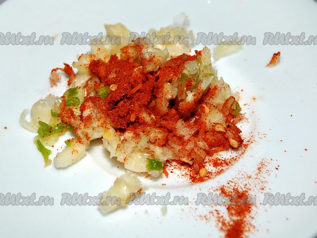 Отдельно смешать растертый чеснок и острый красный перец.