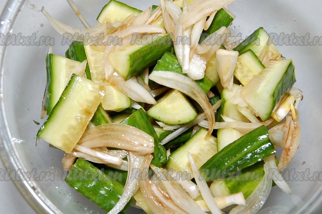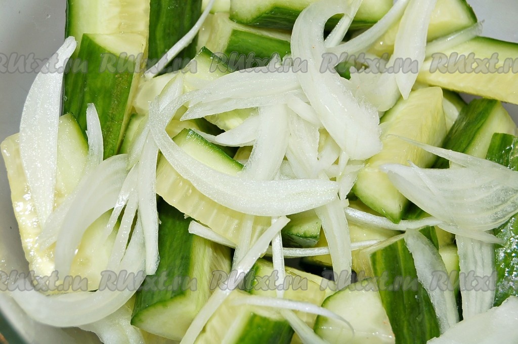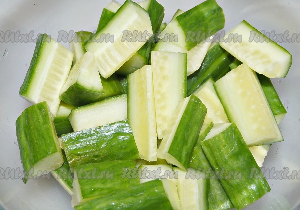 Можно еще вдоль нарезать огурцы, затем поперек, длиной около 3 см, сложить нарезанные огурцы в миску, добавить соль, размешать и оставить на 30 минут.