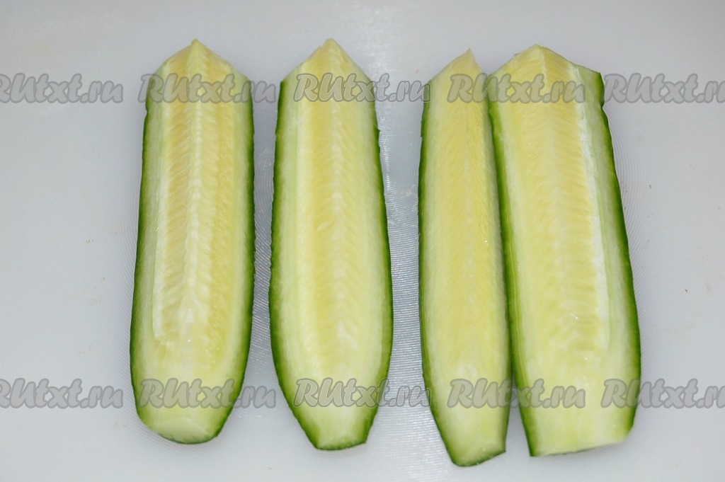 Огурцы сначала нарезать вдоль на четвертинки.