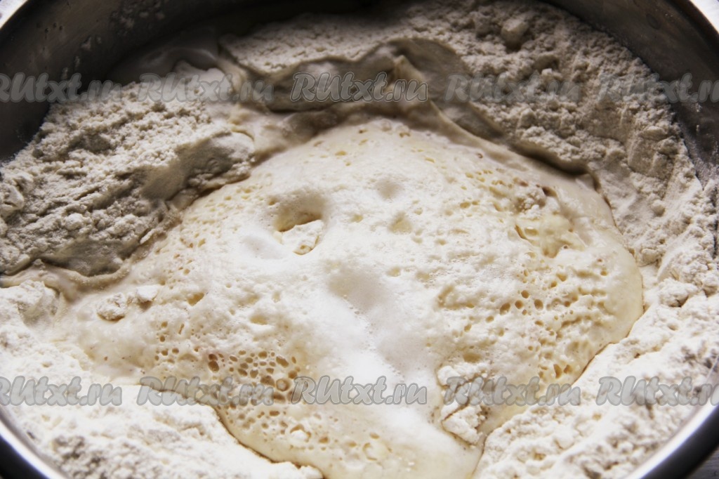 Дрожжи и сахар разводим в теплом молоке. 400 грамм муки высыпаем в миску и делаем в ней небольшое углубление, в которое выливаем молоко, разведенное с дрожжами. Оставляем на 20-30 минут в теплом месте.