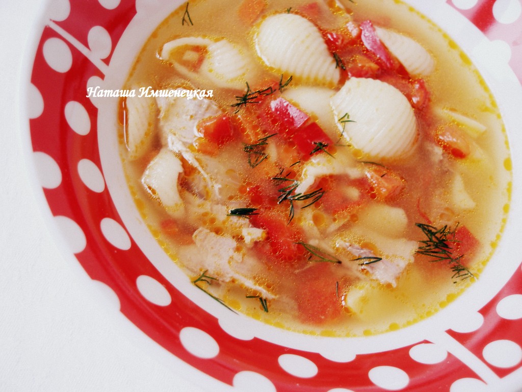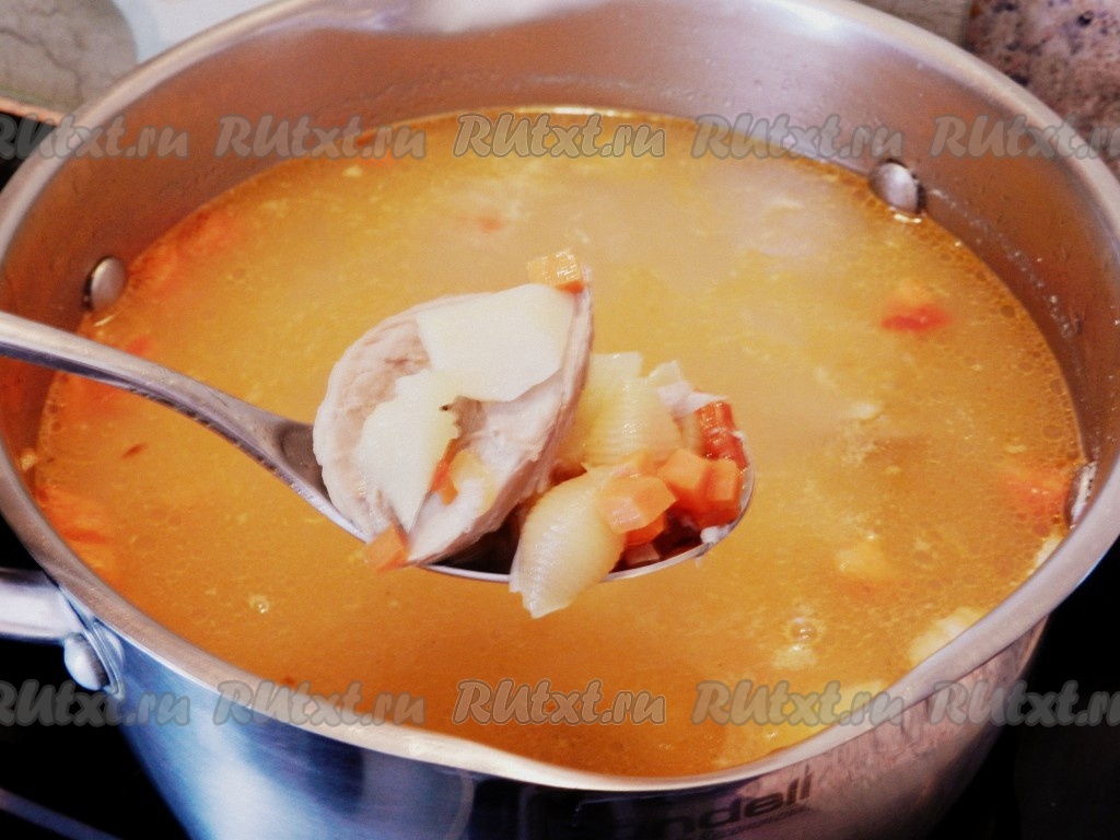 В кипящий бульон всыпать макаронные изделия (у меня ракушки), варить 5 минут. Затем добавить овощную заправку, поварить суп еще 2 минуты и убрать с огня.