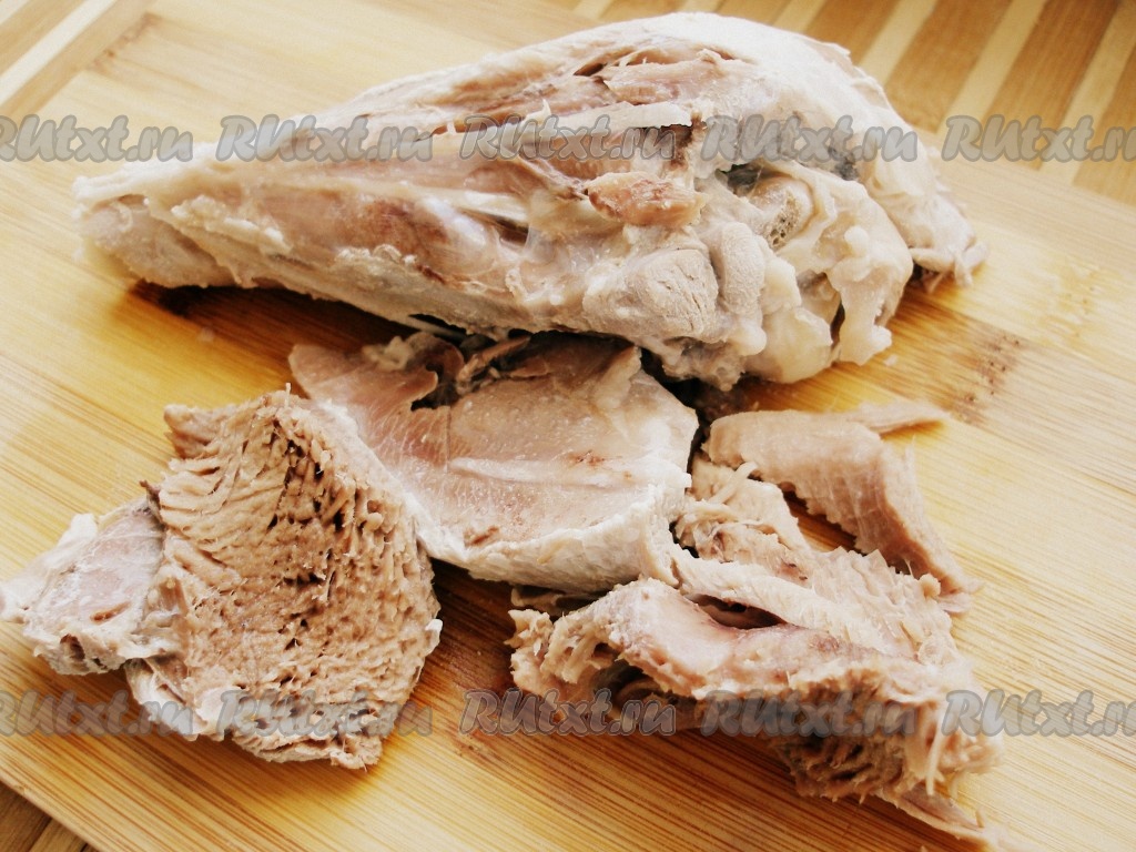 Картофель очистить и нарезать кубиками. Из бульона достать сварившееся мясо, отделить мясо от кости, нарезать небольшими кусочками и вернуть в бульон. Добавить картофель, соль, специи, довести до кипения, варить до полуготовности картофеля.