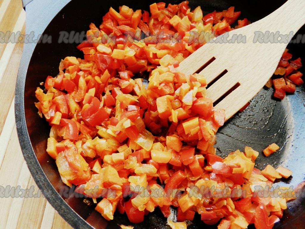 На растительном масле обжарить лук и морковь, затем добавить перец и обжарить все вместе до мягкости.