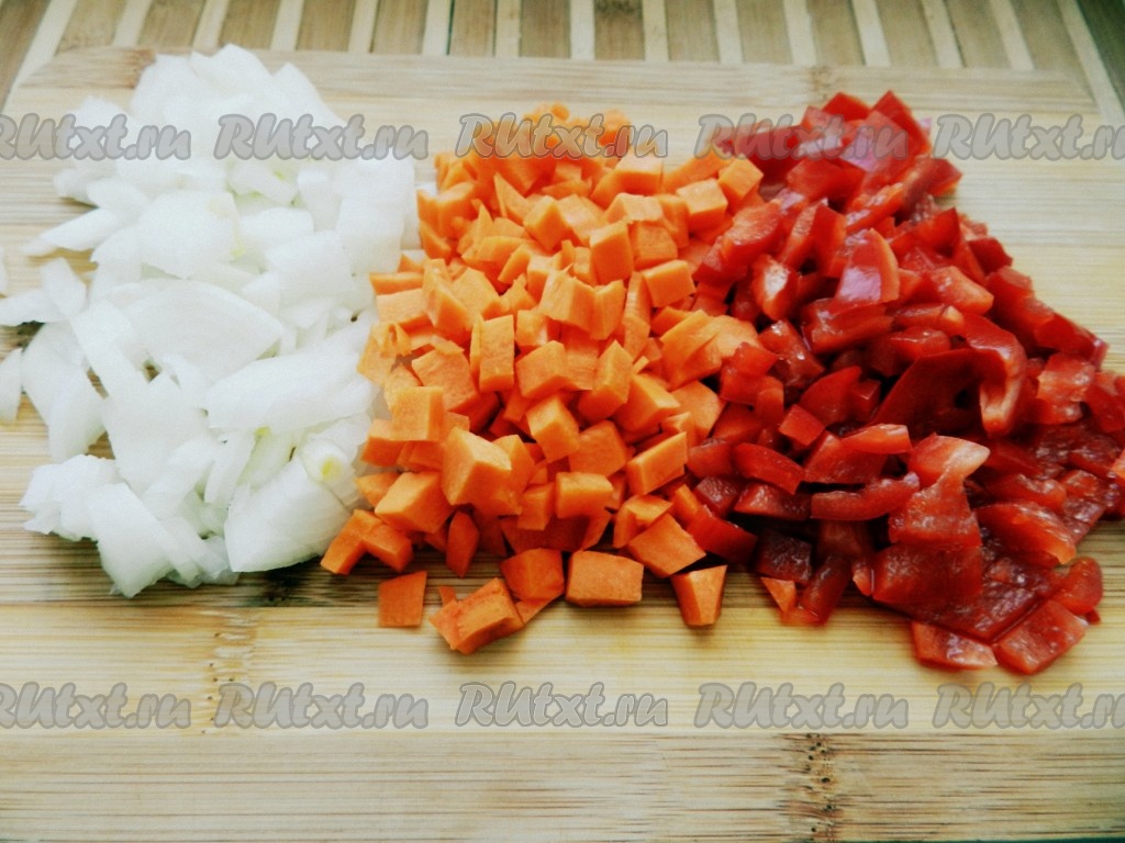 Лук, морковь и перец очистить и нарезать кубиками.