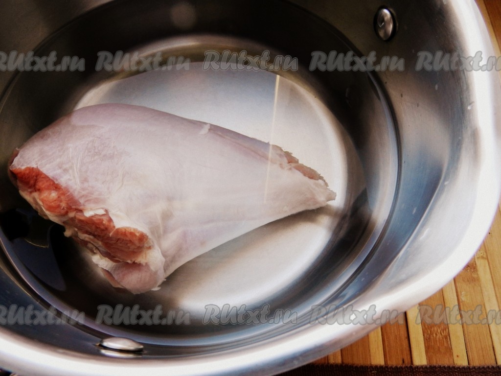 Голень индейки вымыть, положить в кастрюлю, залить двумя литрами воды и поставить варить. Когда вода закипит, снять пену, уменьшить огонь и варить 1 час.