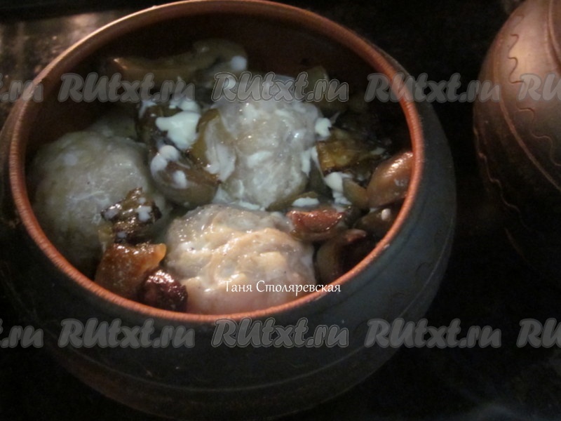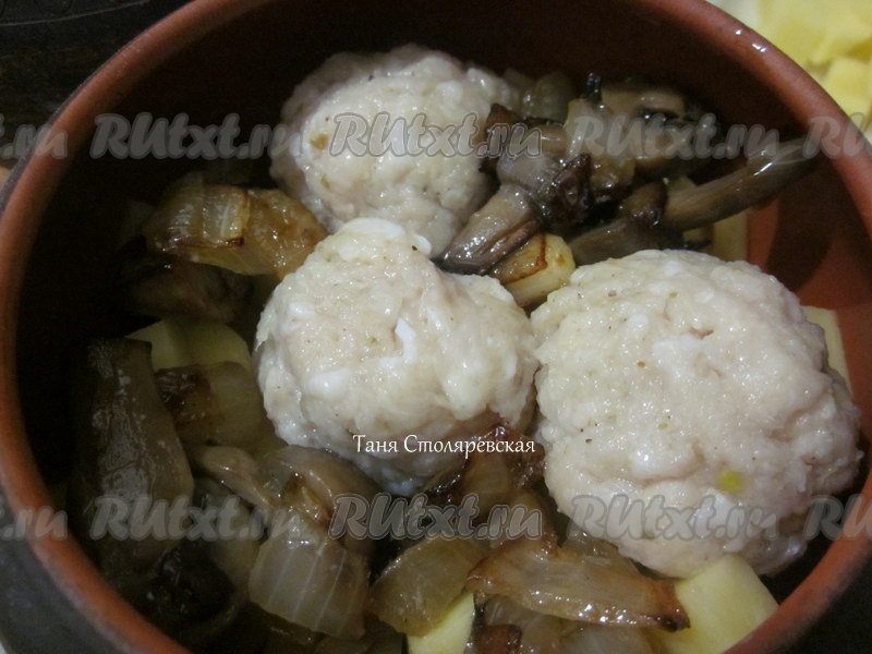 Положить в горшочки картошку, фрикадельки, грибы и посолить.