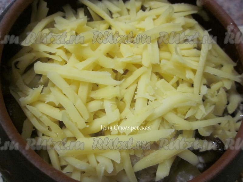 Поставить в неразогретую духовку фрикадельки в горшочках, включить температуру 180-200 градусов на 40-минут. Я проверила готовность картошки ножом, она была практически, готова. Посыпать сверху натёртым на тёрке сыром и поставить ещё минут на 10-15.