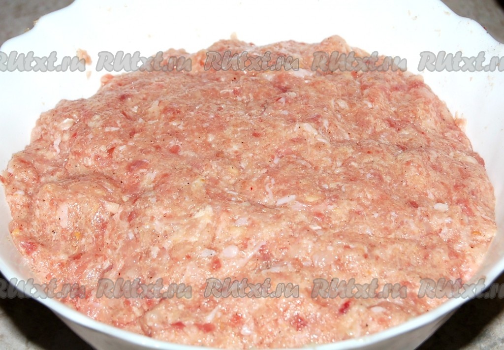 Приготовить фарш с помощью мясорубки из куриного мяса и белого хлеба в сливках. Размешать, посолить, поперчить, отбить.