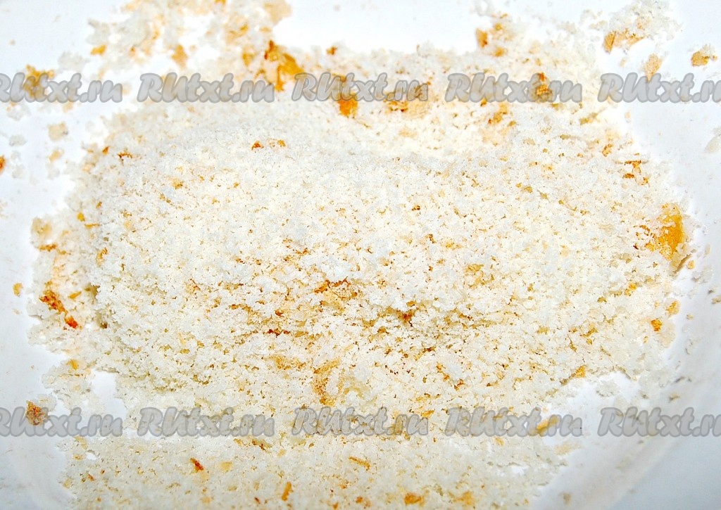 Часть (150 грамм) белого хлеба убрать в морозилку на 1 час. Затем вытащить этот хлеб и натереть на терке. Получатся нежные хлебные крошки.