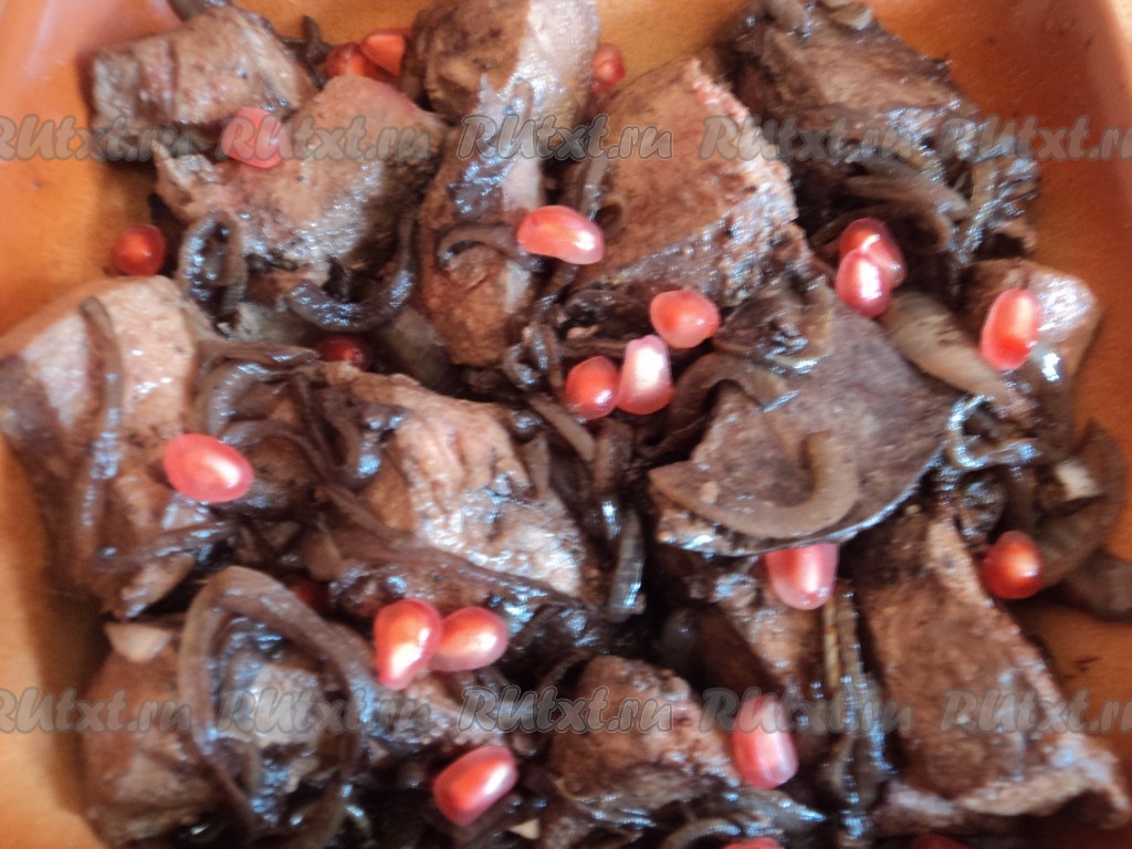 Обжарить печенку быстро в растительном масле с двух сторон до золотистой корочки. Затем переложить в форму для запекания. Репчатый лук нарезать кольцами и обжарить на оставшемся масле. Перец очистить от семян и мелко нарезать, выложить к луку. Выдавить сок граната и вылить его к луку и перцу, дать минуты 2 потушиться, затем снять с плиты.
