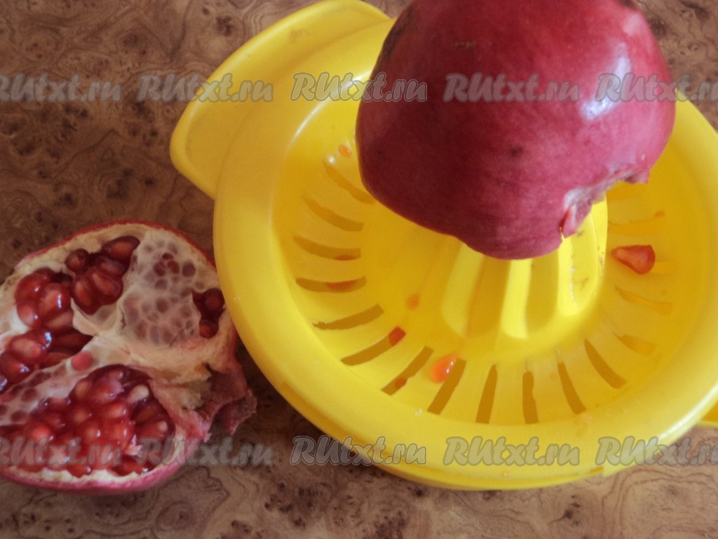 Репчатый лук нарезать кольцами и обжарить на оставшемся масле. Перец очистить от семян и мелко нарезать, выложить к луку. Выдавить сок граната и вылить его к луку и перцу, дать минуты 2 потушиться, затем снять с плиты.