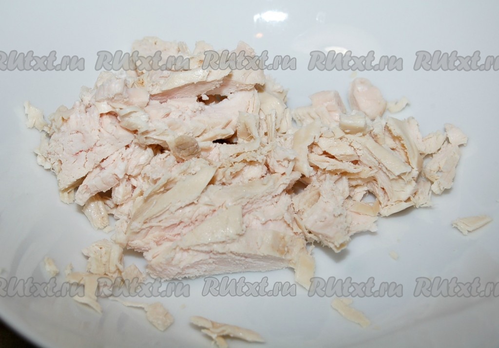 Вареную курицу для жульена мелко нарезать.
