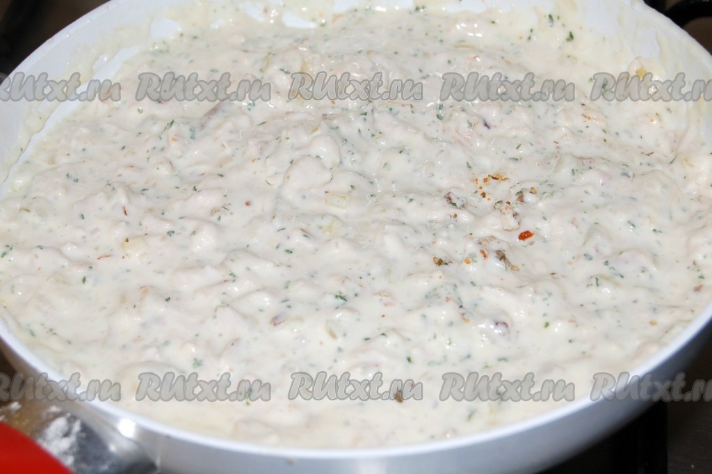 Перемешать со сливками содержимое сковородки и добавить соль, перец, специи.