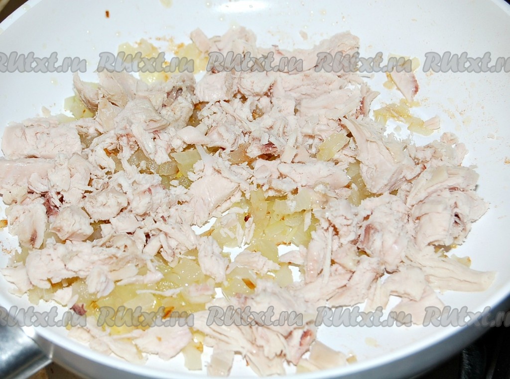 Кусочки нарезанной курицы добавить в сковороду с репчатым луком.