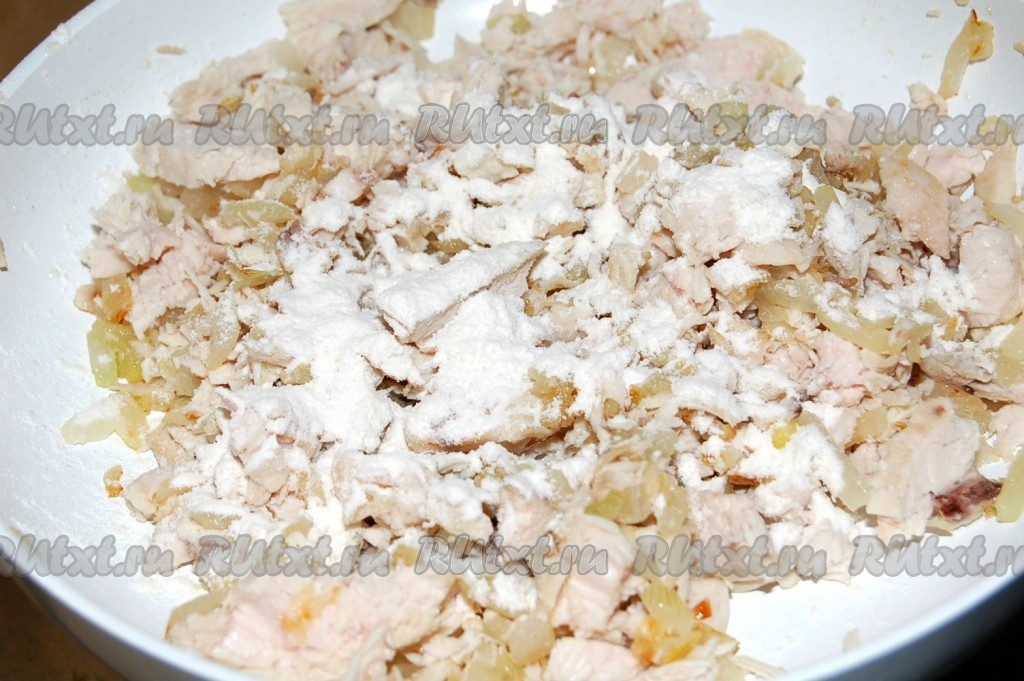 Перемешать и обжаривать до полной готовности лука. Затем добавить муку.