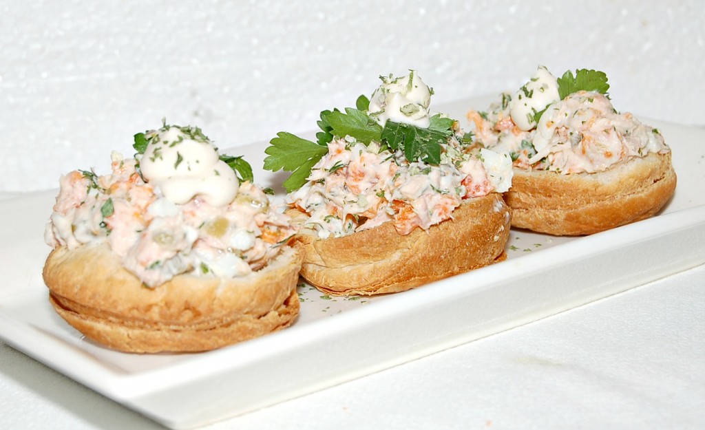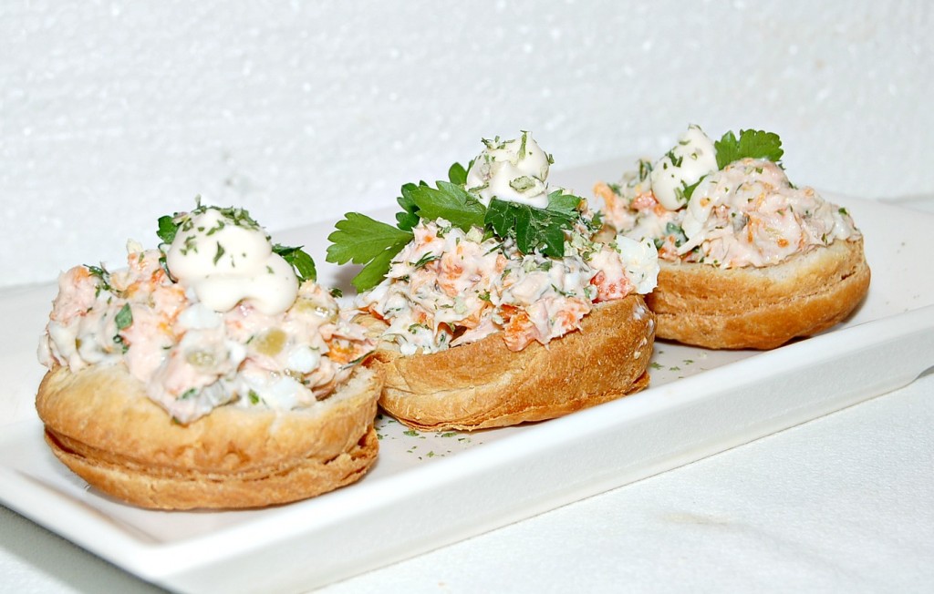 Очень нарядно смотрятся на праздничном столе салаты в булочках. Помимо салатов, в таких булочках удобно размещать паштеты, различные закусочные муссы. А делать такие булочки совсем несложно, причем, приготовить их можно заранее, хоть за неделю до начала праздничного застолья. Проще всего делать их из готового слоеного теста. Слоеное тесто может быть дрожжевое и бездрожжевое, выбирайте на свой вкус.