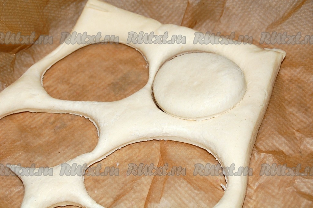 Разморозить готовое слоеное тесто. НЕ раскатывать! С помощью формочки или стакана вырезать кружки из теста.