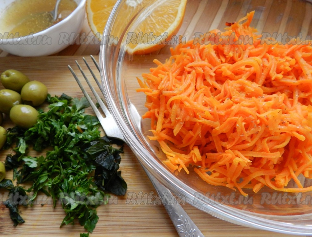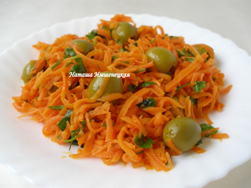 Зелень нарезать, соединить с морковью, полить заправкой, добавить оливки, перемешать.
