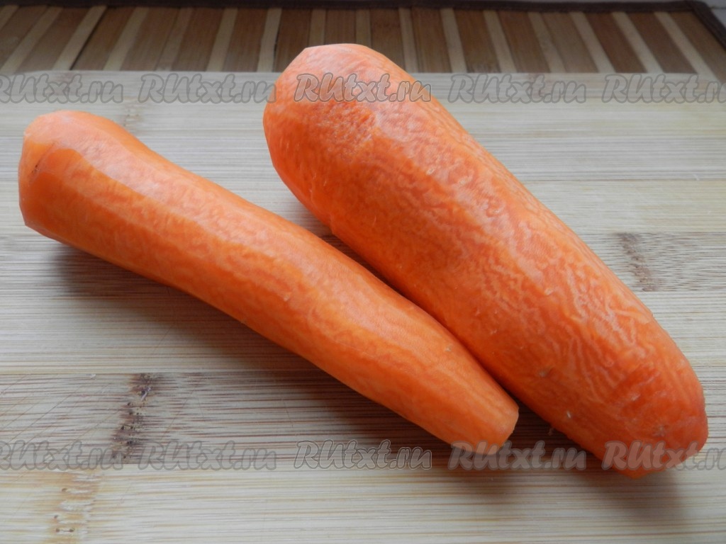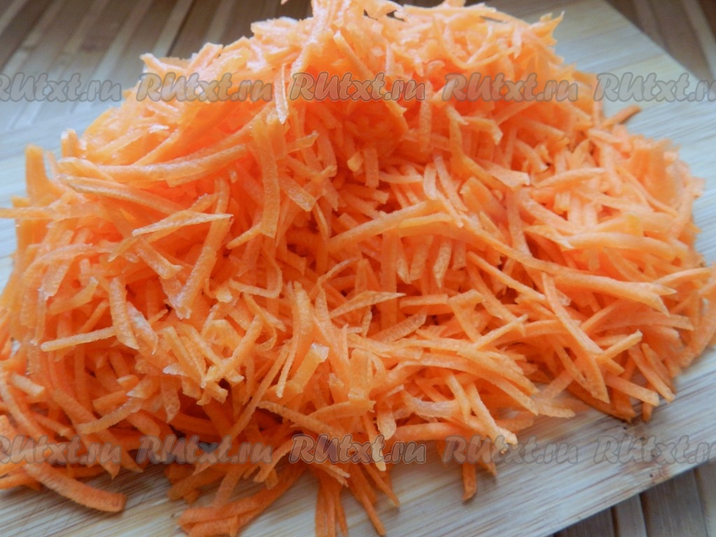 Морковь натереть на средней тёрке, выложить на сковороду, разогретую с оливковым (или другим растительным) маслом, и обжарить на среднем огне, помешивая, до мягкости морковки (на это потребуется минут 5), посолить, снять с огня, дать остыть.