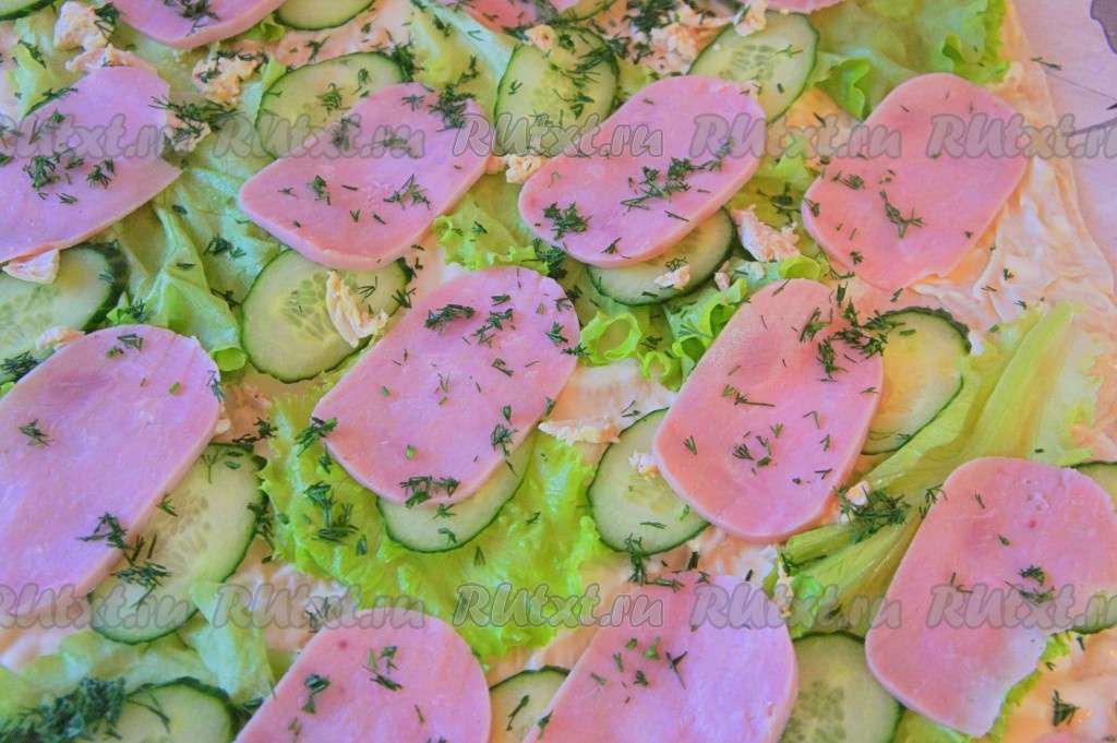 Огурец тонко нарезать и разложить также по всему периметру лаваша.