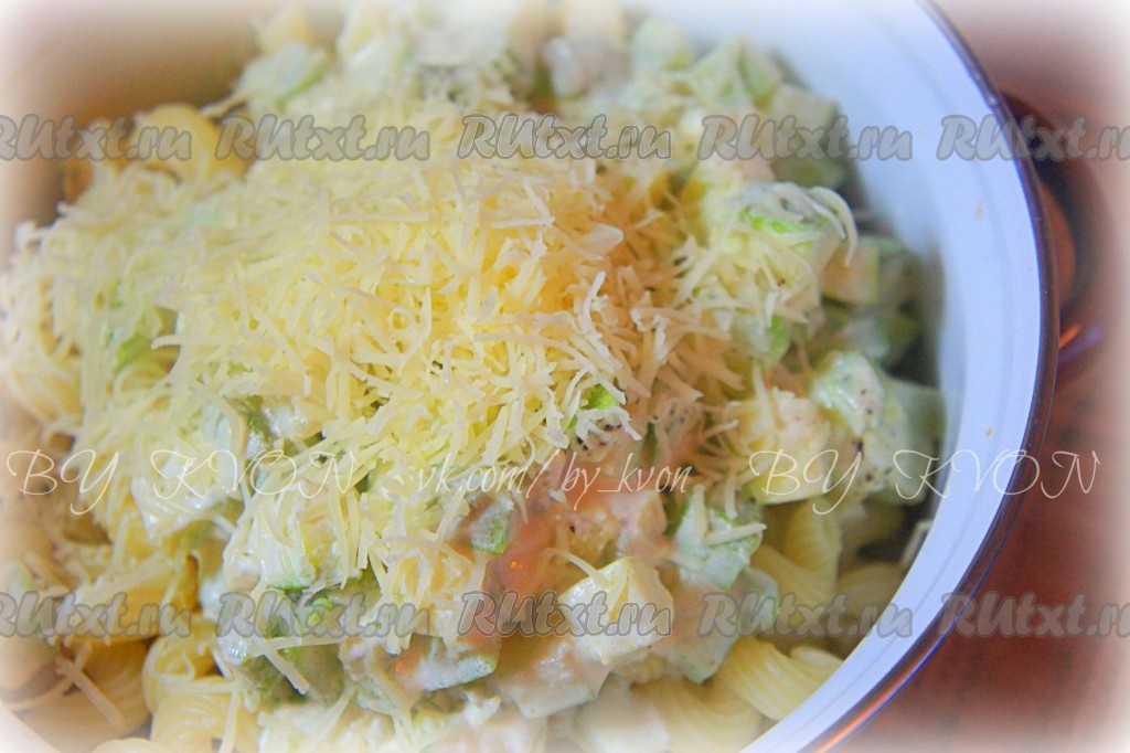 Добавить сыр к пасте с кабачком, всё тщательно и быстро перемешать.
