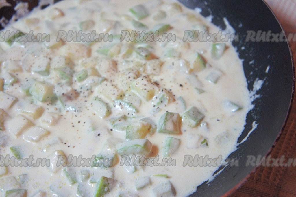 Добавить сливки, соль, чёрный молотый перец, мускатный орех, убавить огонь, накрыть крышкой сковороду или сотейник и готовить кабачок ещё 3-5 минут на медленном огне.