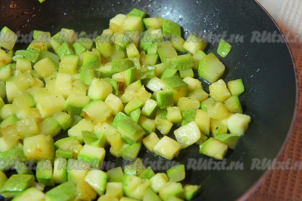 Кабачок нарезать средним кубиком. Если у кабачка жесткая кожура и грубые семечки, удалите их предварительно. Кабачок посолить, добавить специи и обжарить на сливочном масле в течение 2-3 минут на сильном огне при постоянном помешивании.