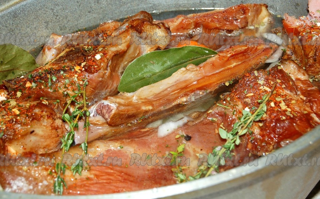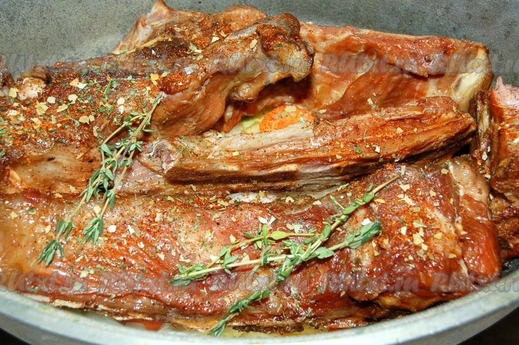 На слой овощей выложить обжаренные копченые ребрышки. Добавить специи, соль.