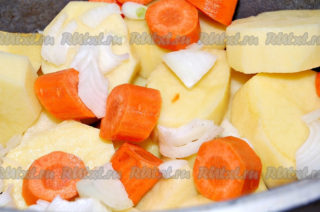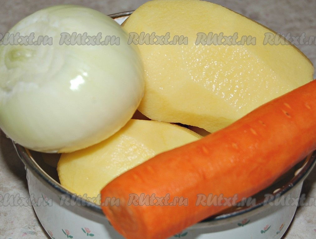 Картошку и морковь нарезать крупно, а репчатый лук помельче. Нарезанные овощи уложить на дно кастрюли.
