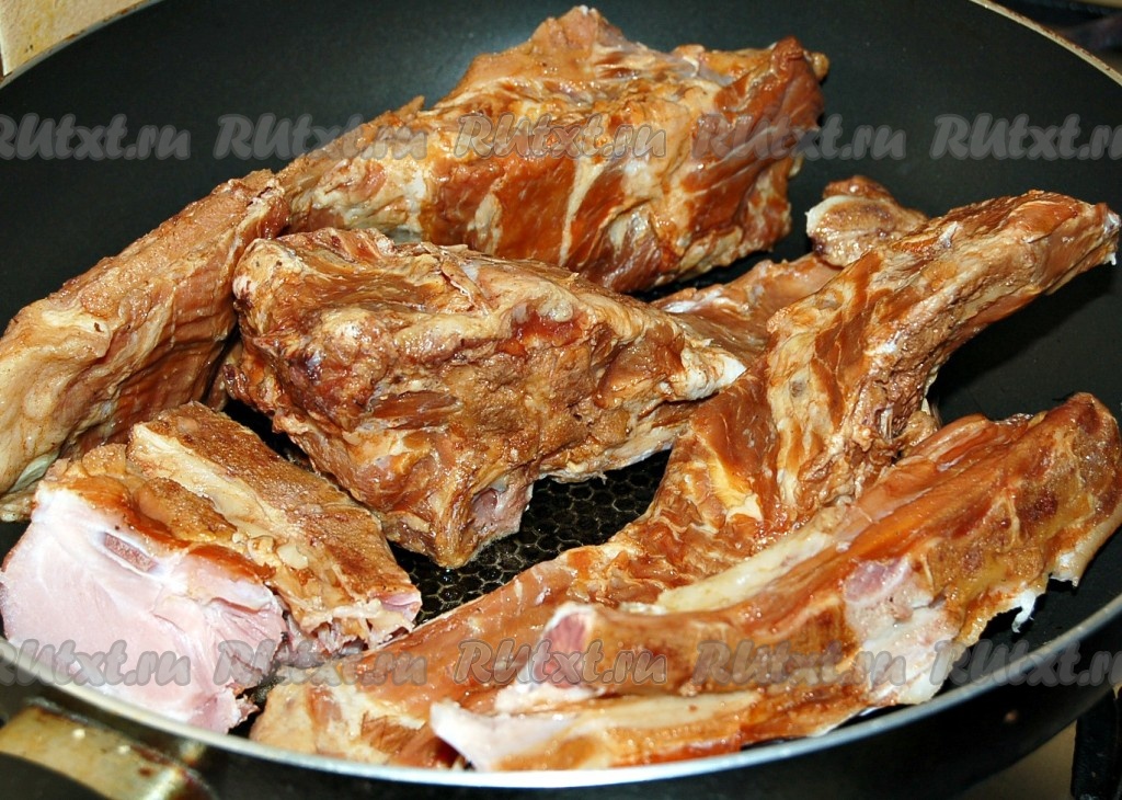 Обжарить копченые ребрышки на растительном масле до легкой румяности.