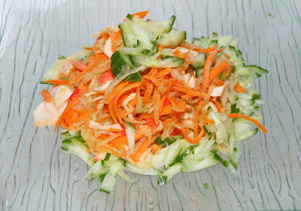 Перемешать салат из моркови с крабовыми палочками, посолить, добавить выбранную заправку и переложить в салатник. Я заправляла лимонным соком и подсолнечным маслом. Добавить прямо в салатник тонко нарезанный свежий огурец.