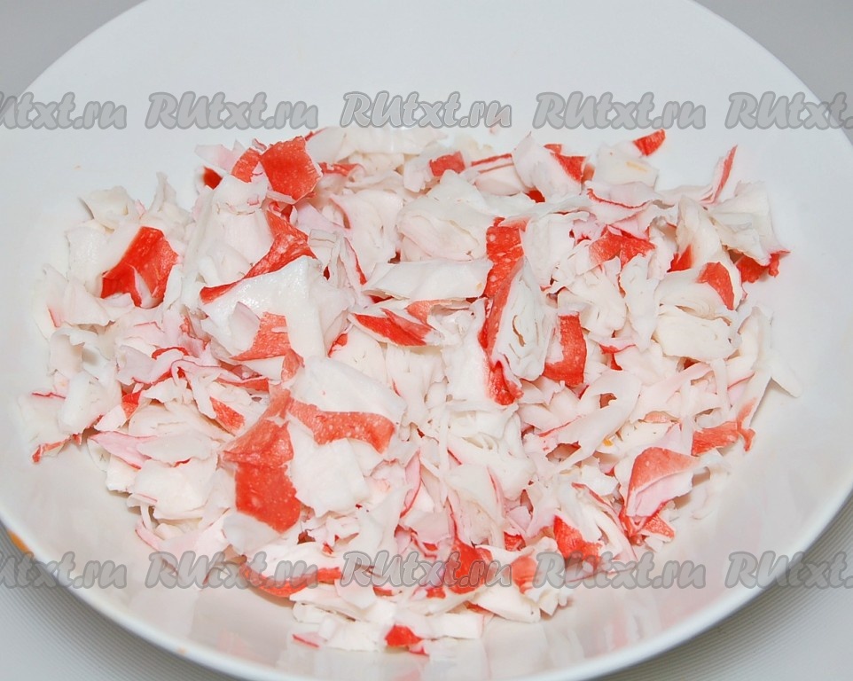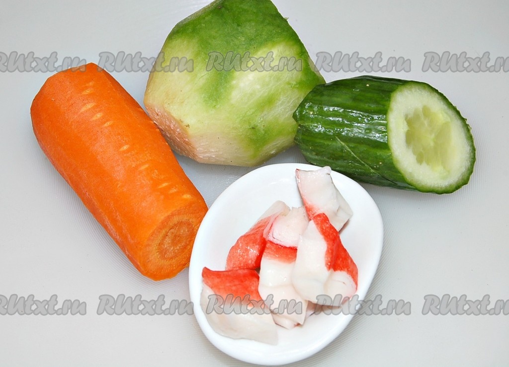 Подготовить овощи. Морковь и редьку очистить от кожуры. Крабовые палочки разморозить.