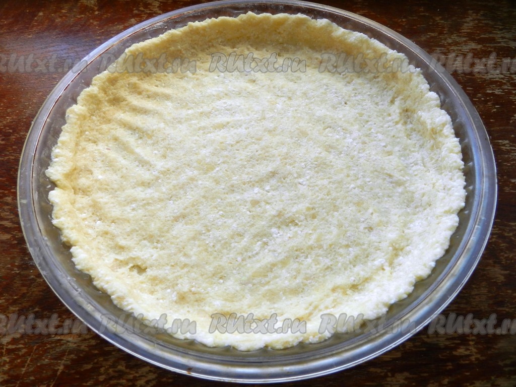 Форму для выпечки (я взяла форму диаметром 26 сантиметров) смазать сливочным маслом, распределить творожное тесто, сделать бортики. Убрать форму с тестом в холодильник на 30 минут.